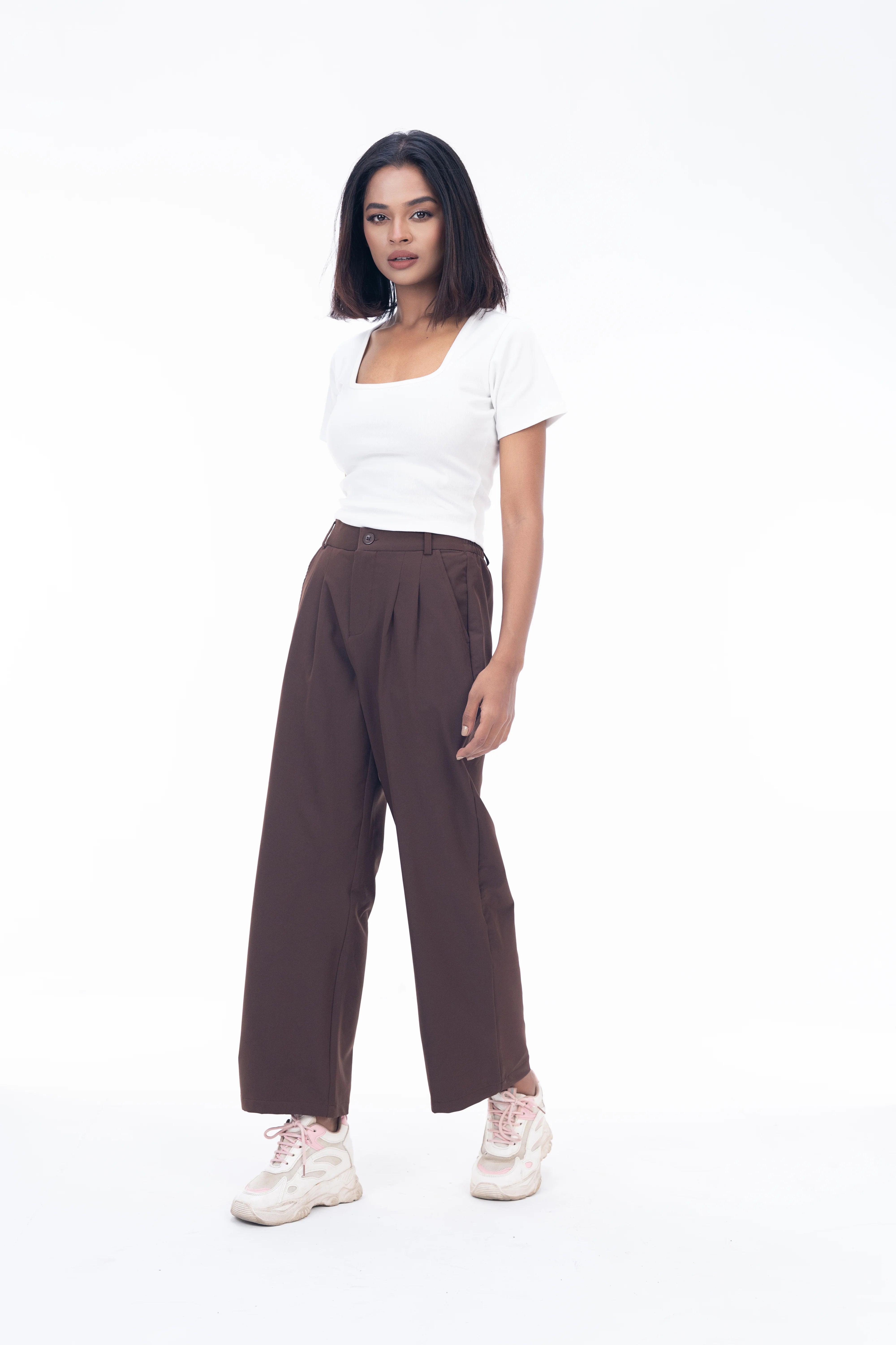 Woman wearing a white t-shirt and brown pants on a white background