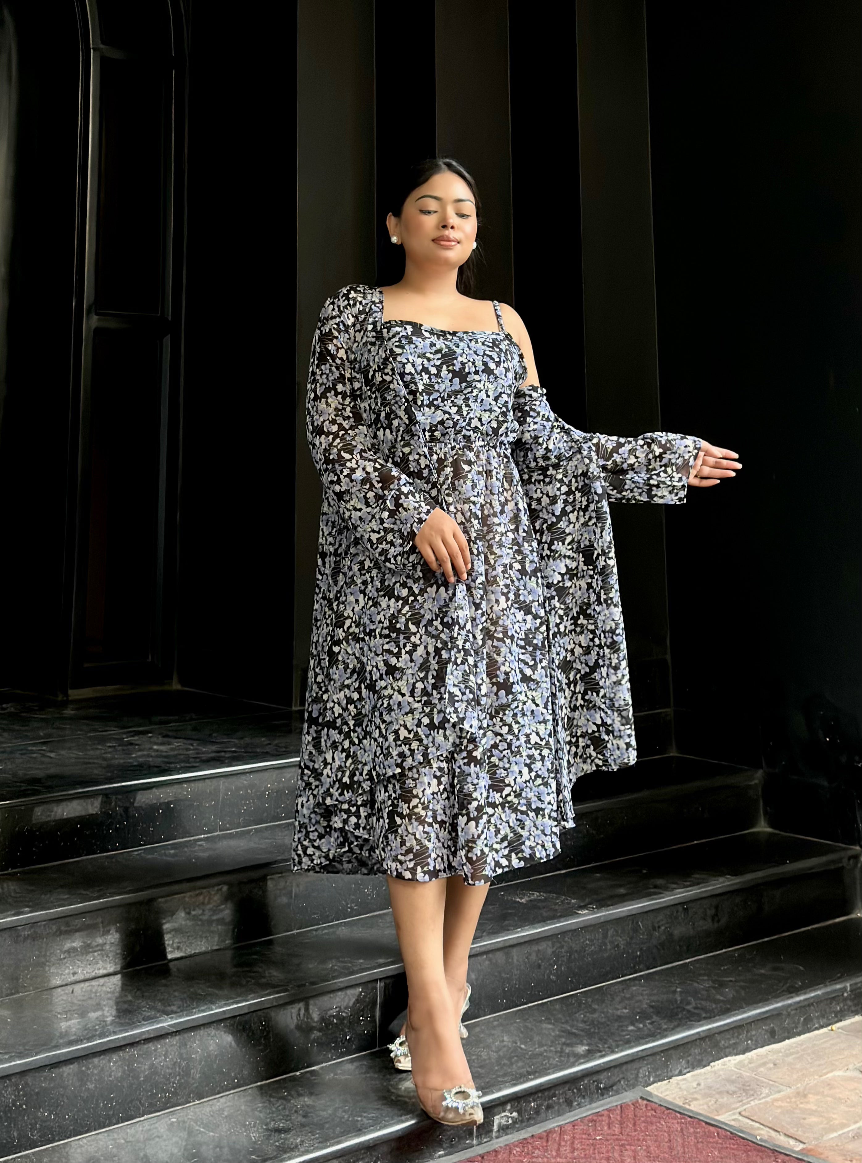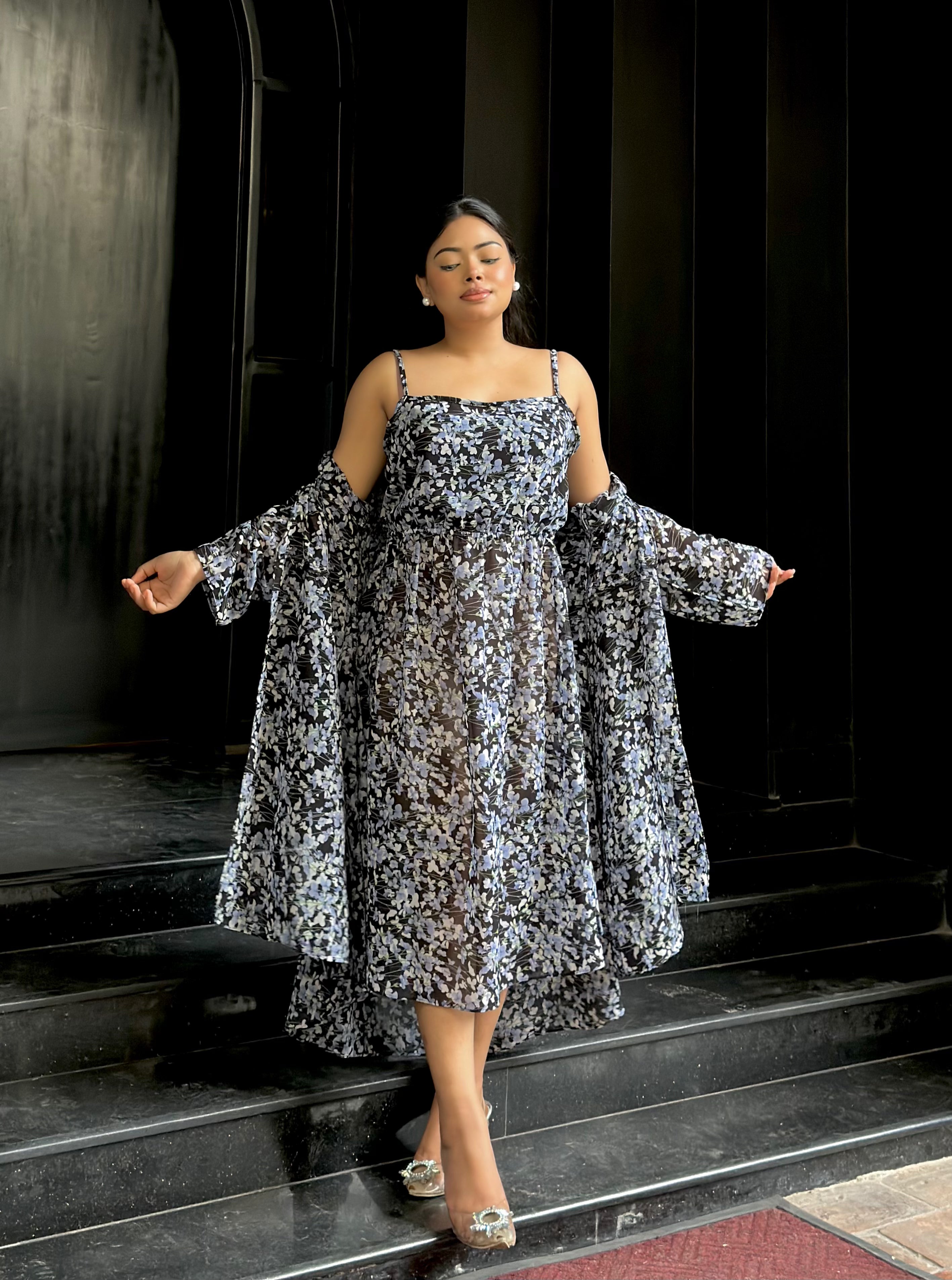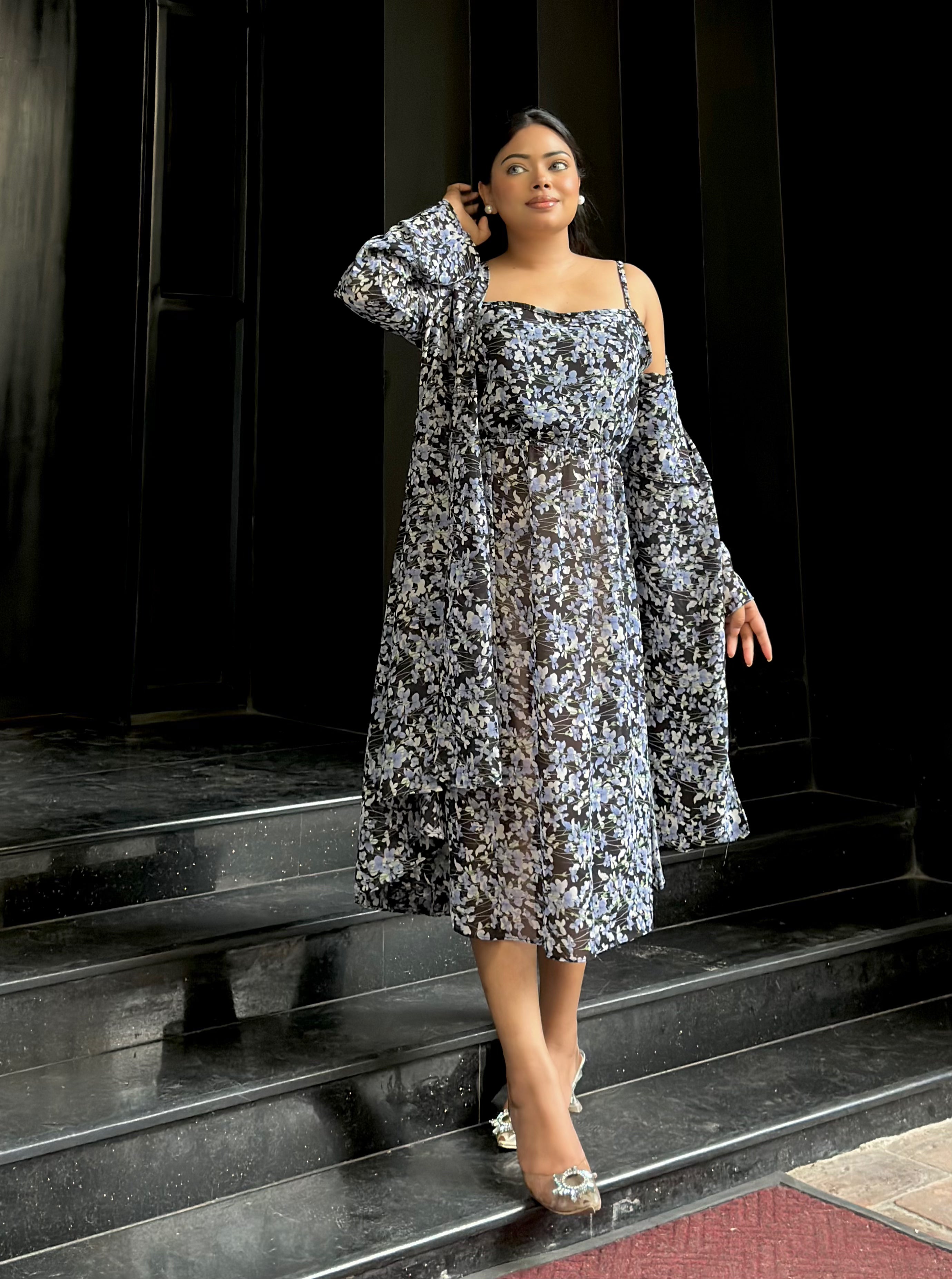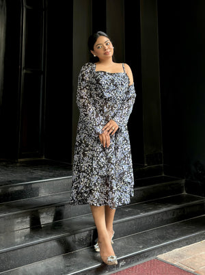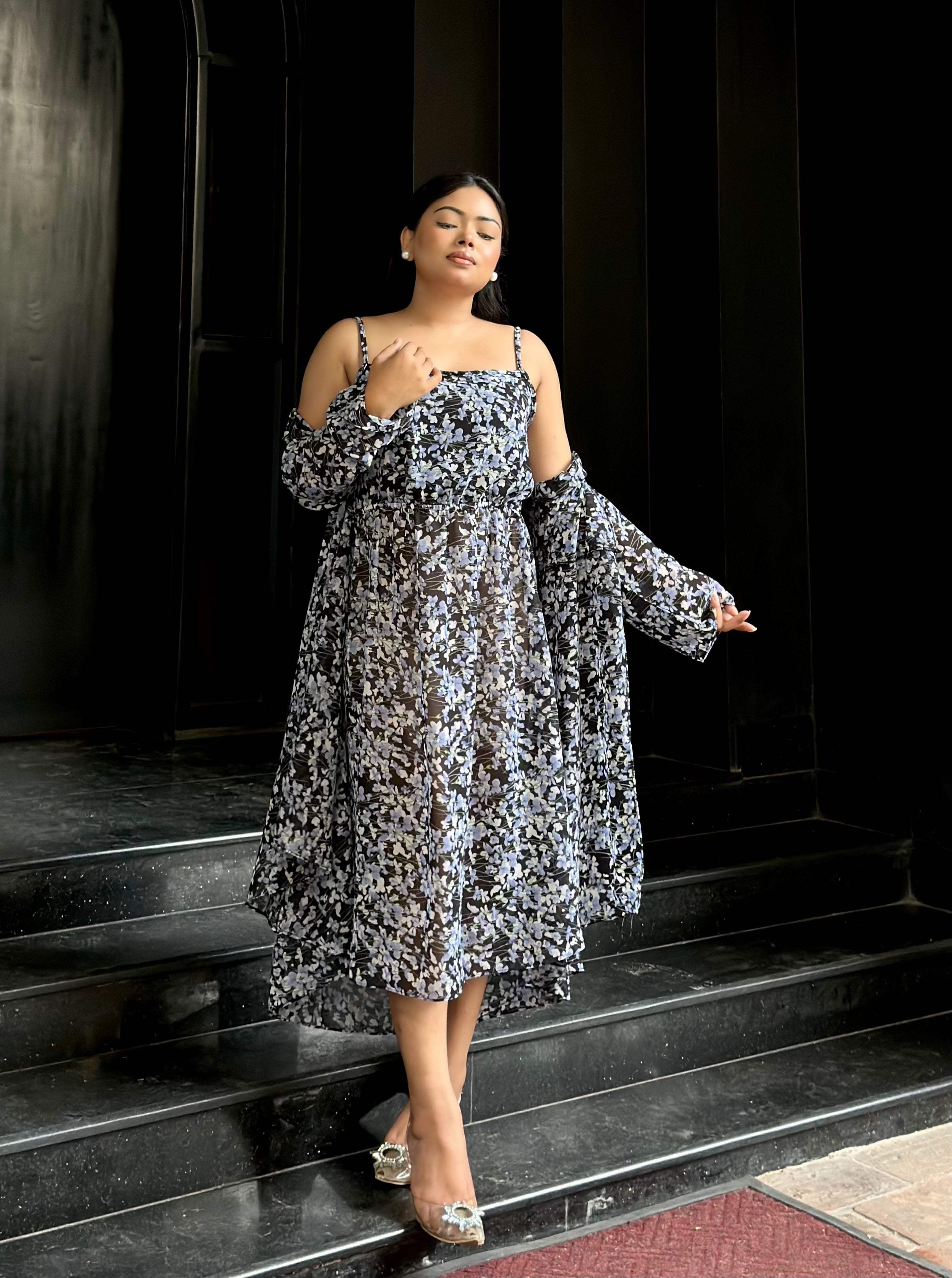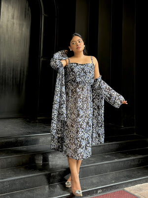 Midi Gown with Shrug Set || Koti Gown Set || Shrug + Midi || Black Blue Floral