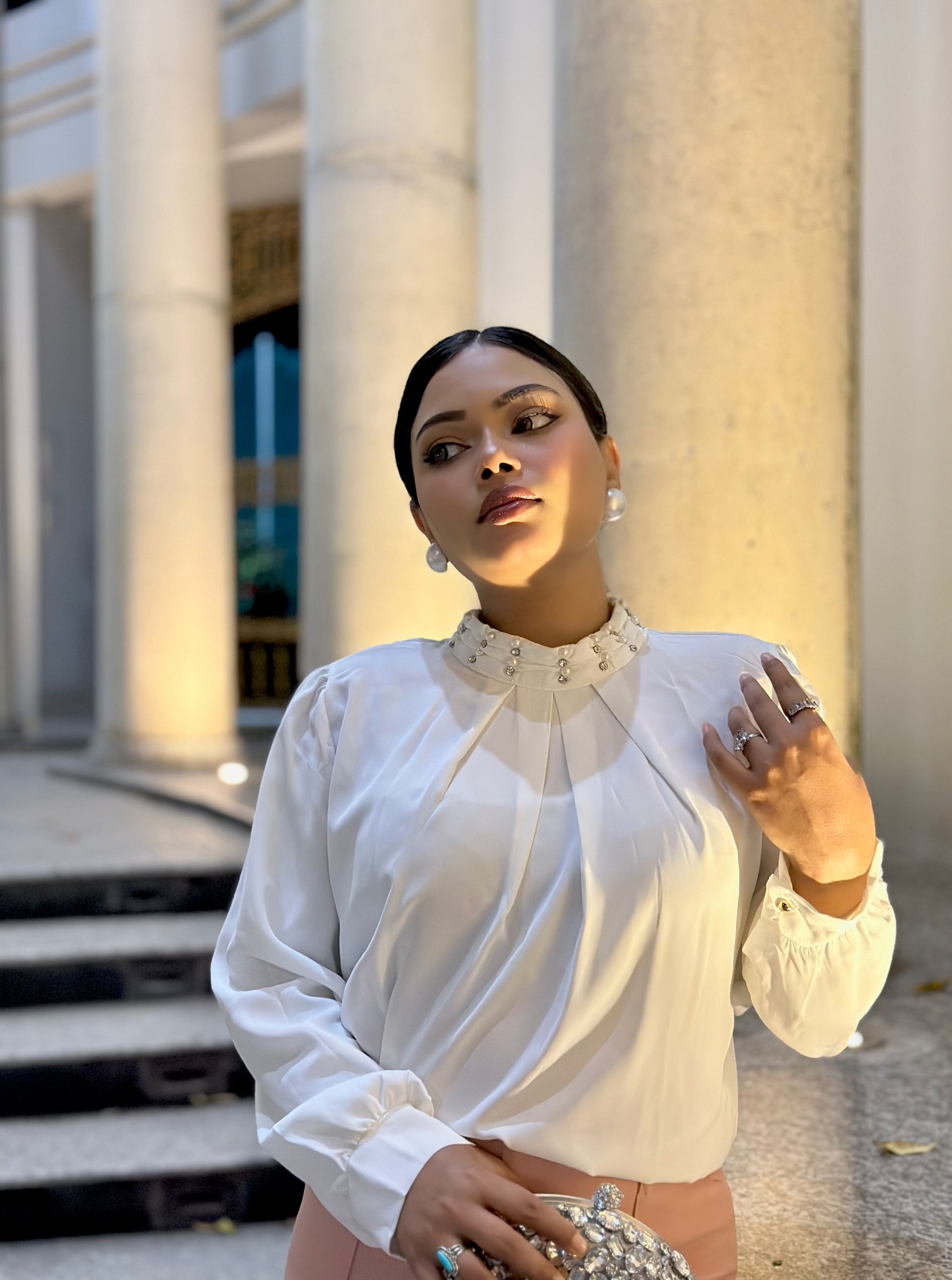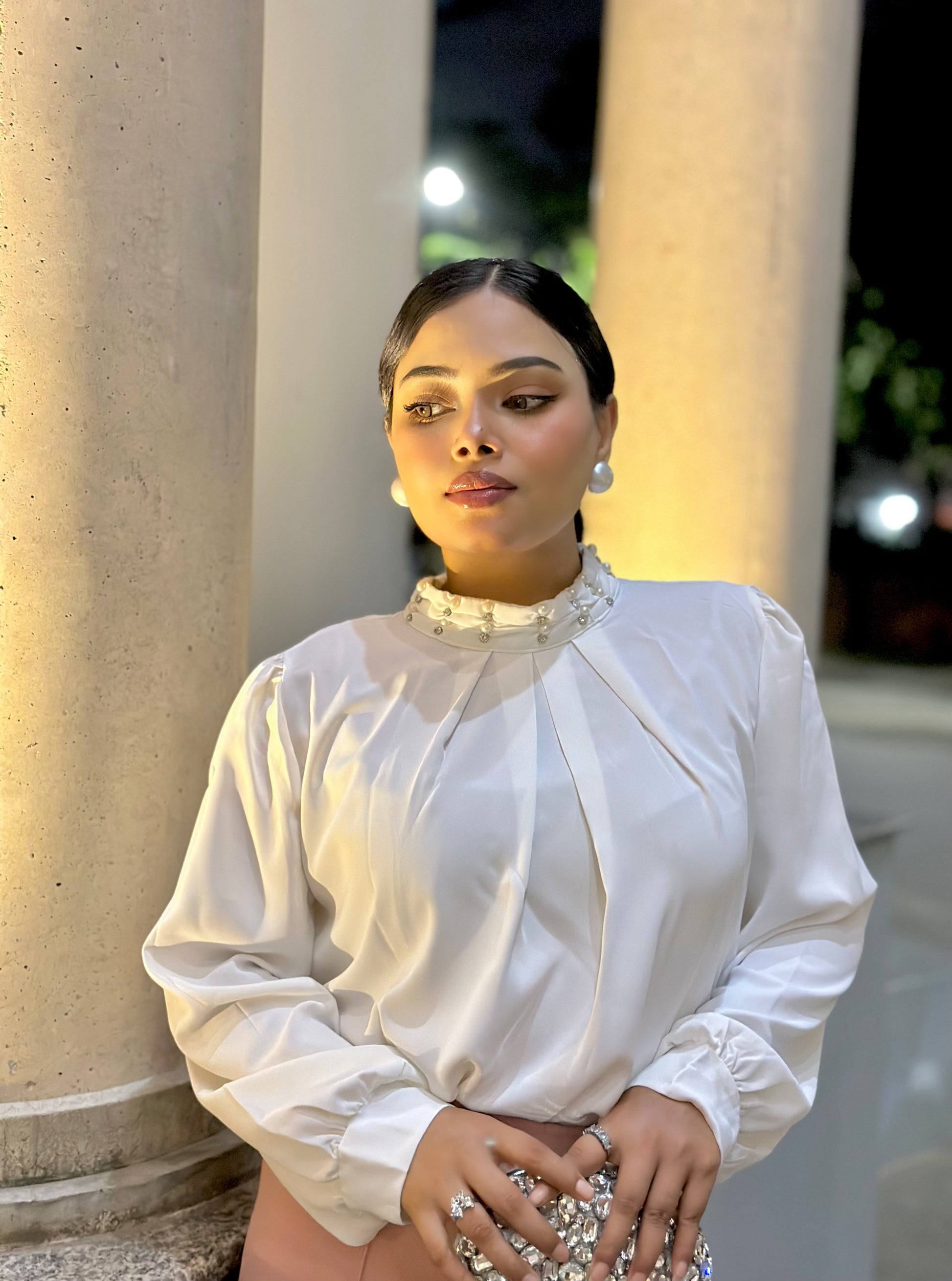 White China Imported Premium Stone-Neck Top | Loose Fit Full Sleeve Top for Women