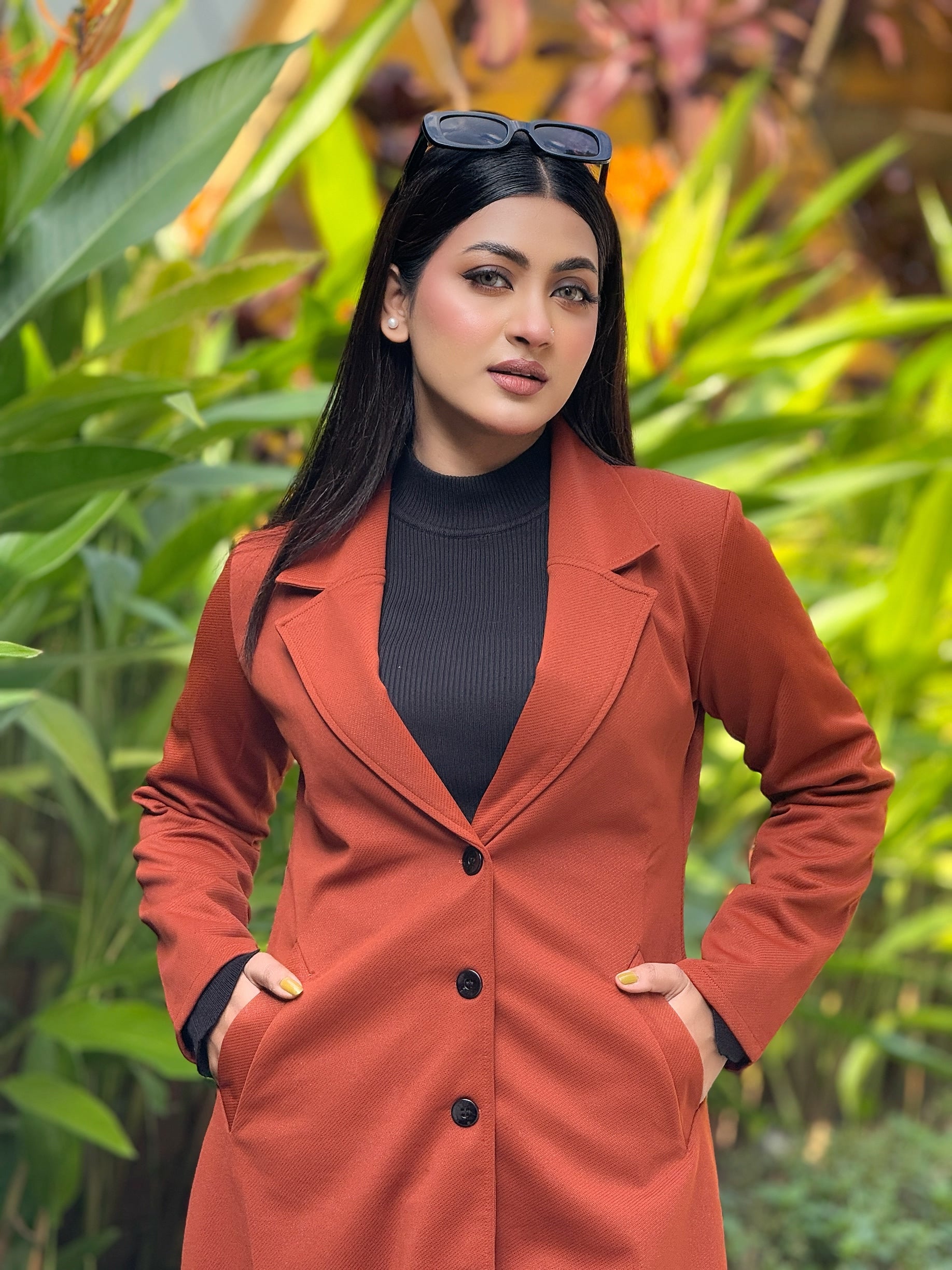 Keep yourself warm and classy this winter with our Winter Special Ladies Long Overcoat in stunning Terracotta color . Crafted from high-quality wool-blend fabric, this coat combines elegance with comfort. Its long, structured cut gives a smart and timeless winter look, perfect for office, business meetings, travel, or casual outings.