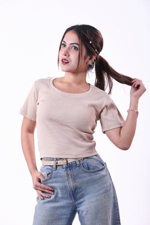 Ladies Round Neck Crop Top – Basic Short Sleeve Slim Fit t-shirt || Warm-White