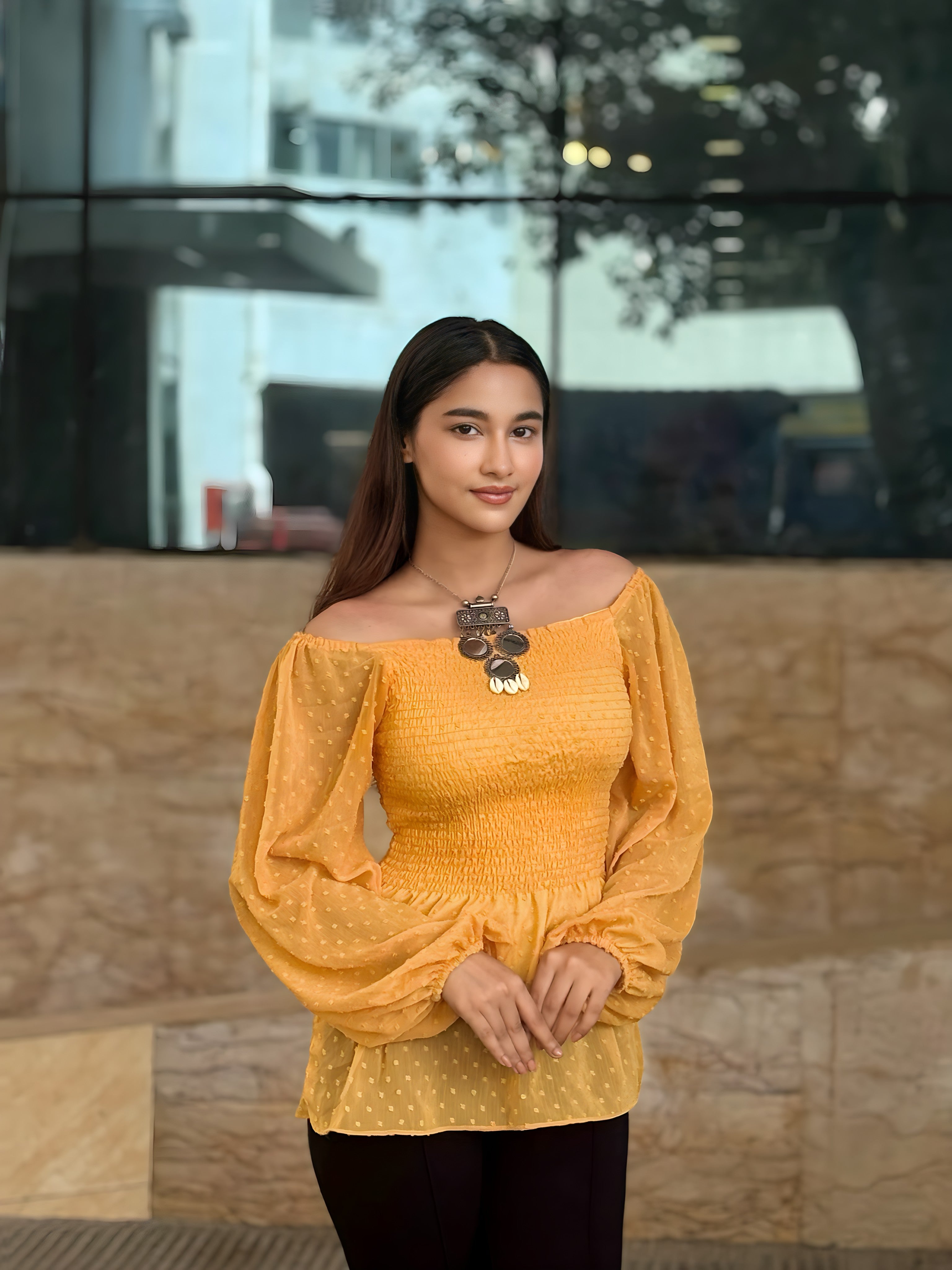 Eye-catching Design, stylish Smokey design, full-length Huge Gher balloon sleeves, and a slim-fit silhouette that feels smooth against the skin. A trendy, statement piece for any wardrobe.