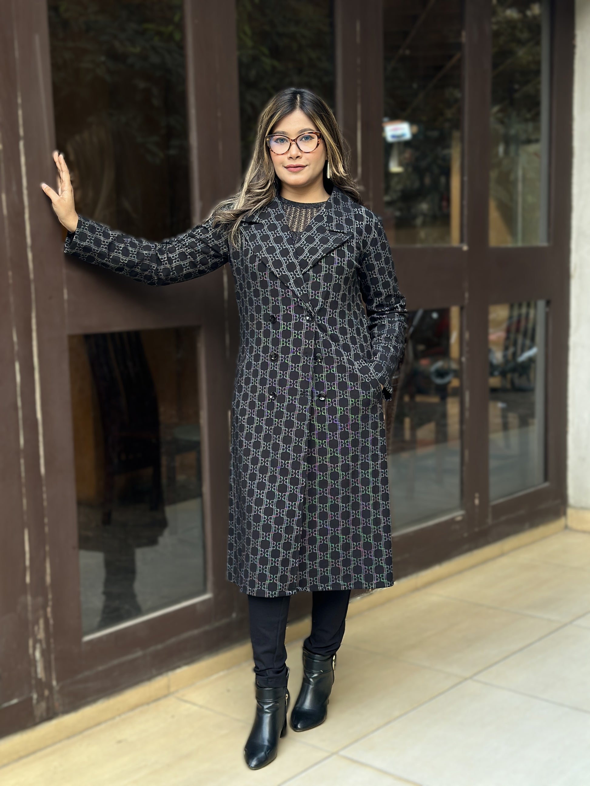 Special Ladies Long Overcoat in B Check || Black